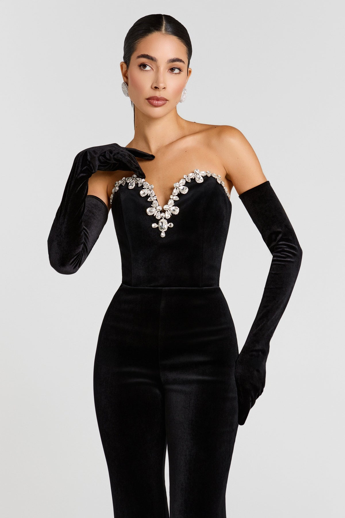 Niezwykle elegancki, pełen wyrafinowania i ponadczasowego uroku Velanya Noir Couture to kombinezon, który łączy w sobie luksusowy aksamit z jubilerskim detalem, tworząc efekt prawdziwej wieczorowej perfekcji.
