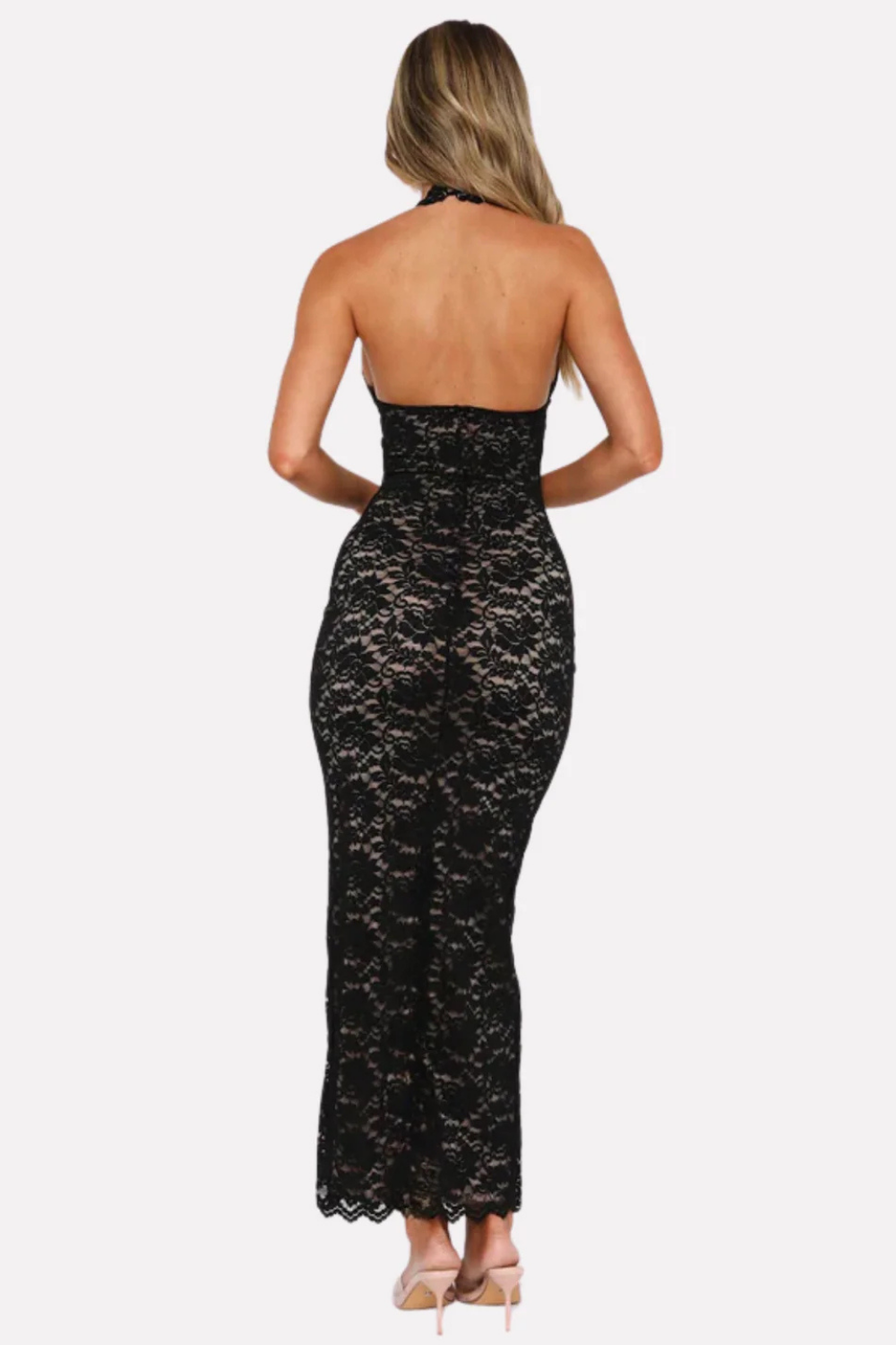 Suknia Vivienne to esencja zmysłowej elegancji w klasycznym wydaniu. Wykonana z delikatnej czarnej koronki na cielistej podszewce, tworzy efekt subtelnej przejrzystości, który pięknie podkreśla sylwetkę. Głęboki dekolt halter i odkryte plecy nadają jej wyjątkowego charakteru, a dopasowany, wydłużony krój eksponuje kobiece kształty z wyrafinowaną precyzją.